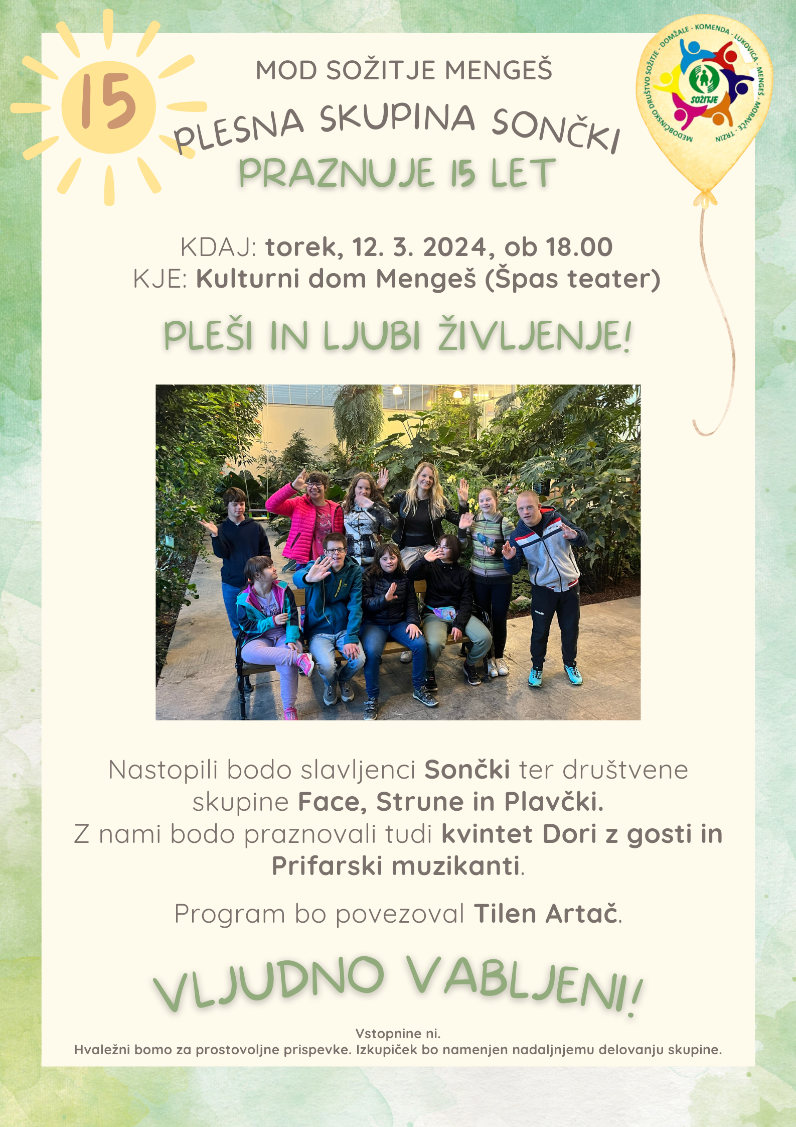 Plesna skupina Sončki, ki deluje znotraj MOD Sožitje Mengeš, v letošnjem letu praznuje 15 let. Obletnico bodo obeležili s slavnostno prireditvijo.