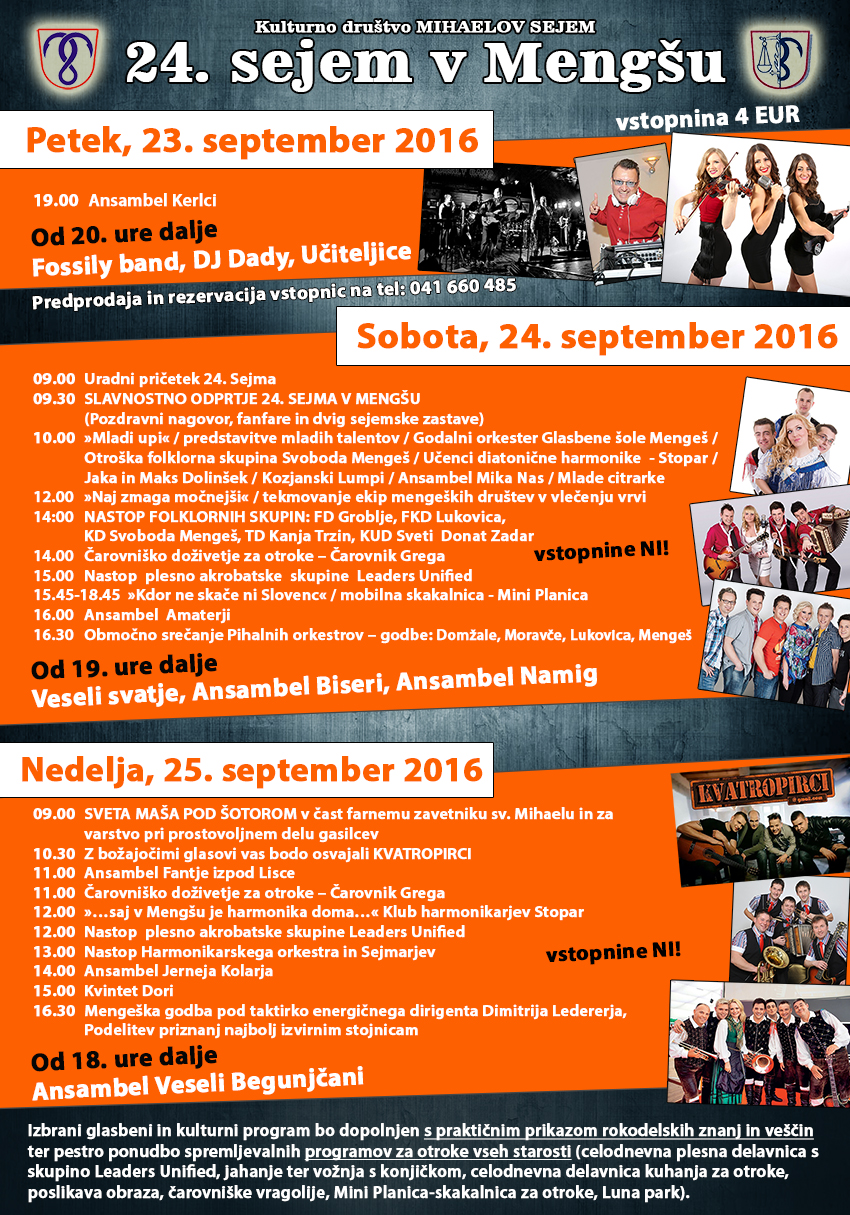 Tradicionalni 24. sejem v Mengšu v organizaciji Kulturnega društva Mihaelov sejem, vabi na zanimiv glasbeni in kulturni program - nastopili bodo: že v petek zvečer Fossily band in zapeljiva ženska zasedba Učiteljice, v soboto in nedeljo pa radoživi Veseli svati, mladi glasbeni talenti, folklorne skupine, pihalni, godalni ter harmonikarski orkestri, ansambli Biseri, Namig, Jerneja Kolarja, kvintet Dori, Veseli Begunjčani...