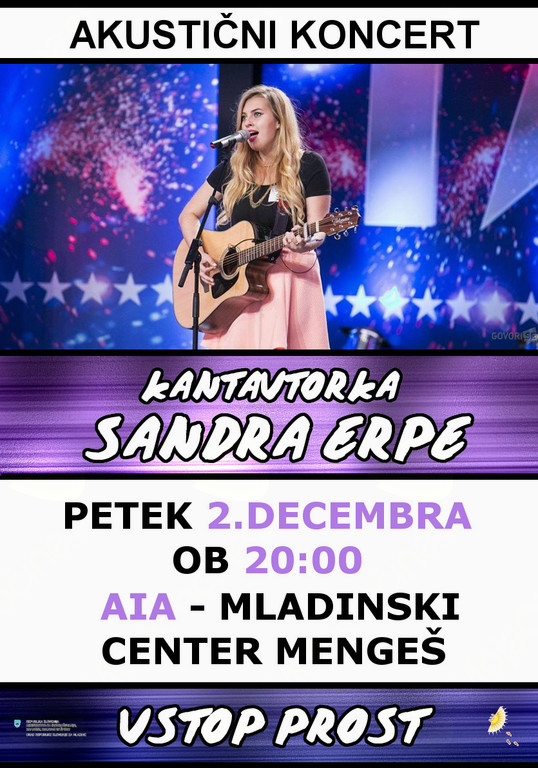 Akustični koncert inštrumentalistke in čudovite mlade vokalistke Sandre Erpe, ki nas bo tokrat v sklopu svoje turneje obiskala tudi v Mengšu. Vabljeni na večer poln dobre kantavorske glasbe in pozitivne energije, ki bo prijetna uvertura v praznične dni.