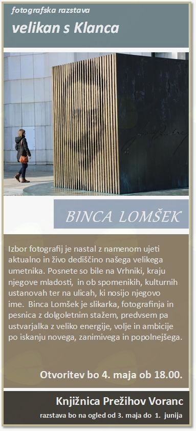 Članica Likovnbega društva Mengeš je ob 100-letnici smrti Ivana Cankarhja pripravila fotografsko razstavo z naslovom "VELIKAN S KLANCA". Odprtje razstave bo v MKLJ Knjižnici Prežihov Voranc v Ljubljani, Tržaška cesta 47 a, v petek 4.5.2018 ob 18.00 uri. Razstava bo na ogled do 1.6.2018. Vljudno vabljeni!