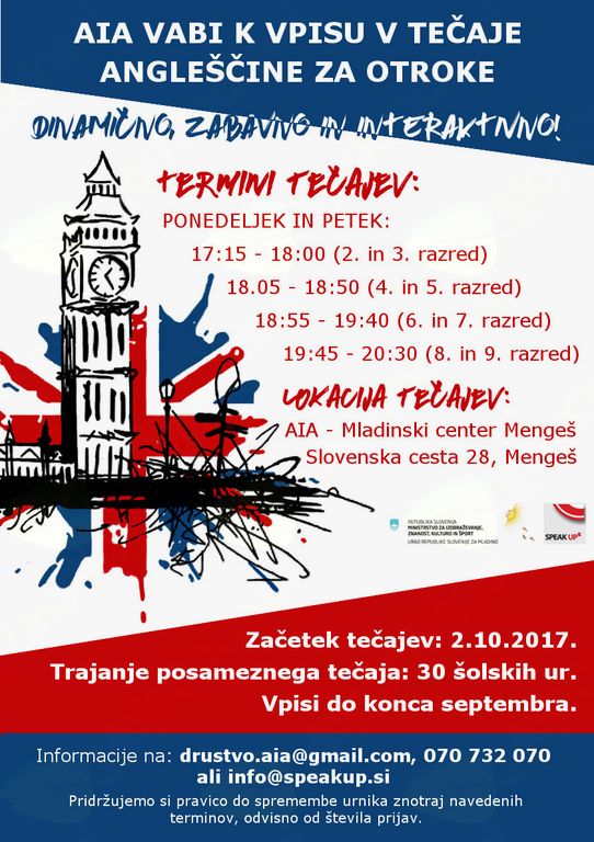 AIA - MLADINSKI CENTER MENGEŠ VABI K VPISU NA TEČAJE ANGLEŠČINE ZA OTROKE