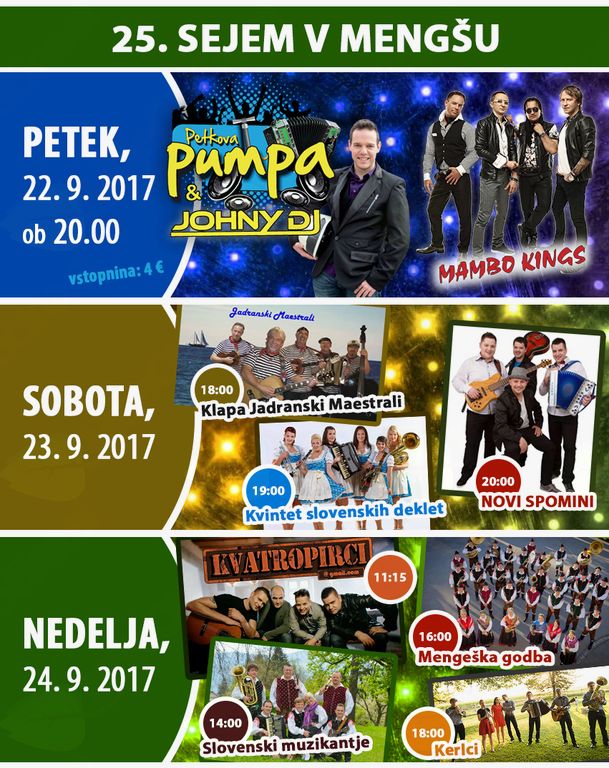 Od petka 22. do nedelje 24. septembra 2017, bo v naravnem okolju Športnega parka in drevoreda, potekala prireditev 25. Sejem v Mengšu.
