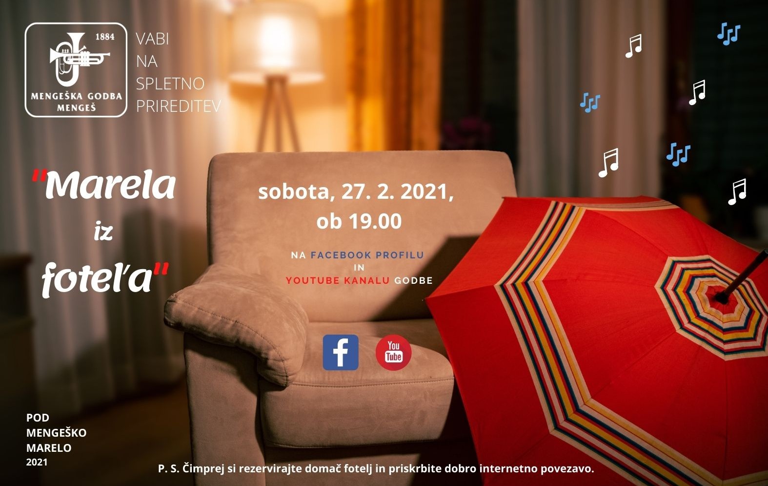 Mengeška godba vsako leto februarja organizira tradicionalno prireditev Pod mengeško marelo. Tudi letošnje leto ne bo izjema. Tokratna "Marela", že 37. po vrsti, bo v soboto, 27. 2. 2021, ob 19.00 kar iz domačega fotel'a. Po prireditvi bo tudi zakuska in druženje z godbeniki.