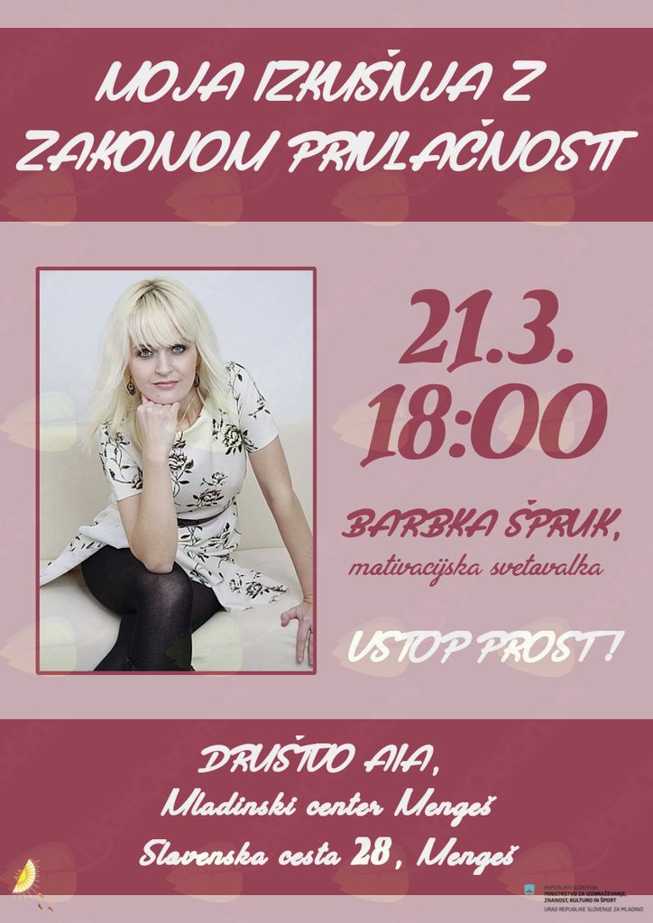 Na predavanju v Mladinskem centru AIA v Mengšu bom spregovorila o zakonu privlačnosti, ki je meni leta 2011 popolnoma spremenil pogled na življenje in mi potrdil moje spoznanje, da je vse v naši glavi, da mi sami oblikujemo svoj svet.