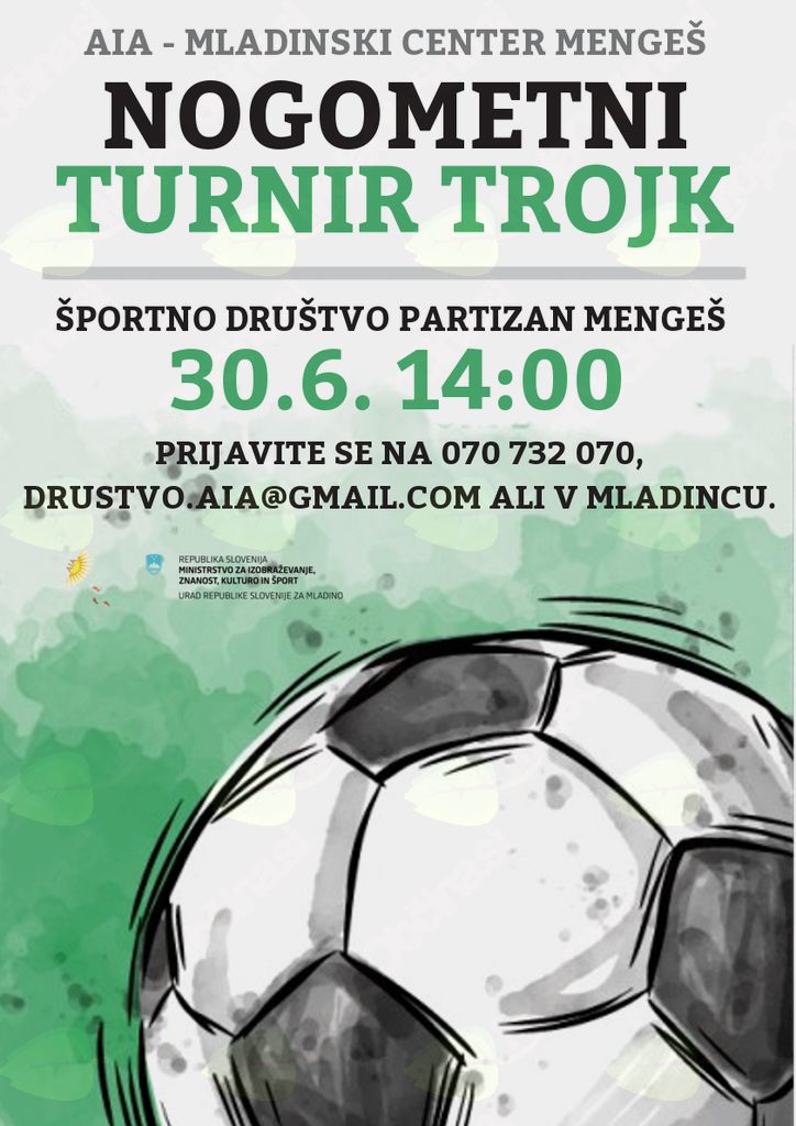 Če radi igrate nogomet in se bi radi preizkusili proti drugim ekipam vas vabimo na nogometni turnir trojk, ki bo potekal 30.6. ob 14.00 pred ŠD Partizan v Mengšu. Turnir bo potekal v vsakem primeru, v primeru dežja bo v dvorani.