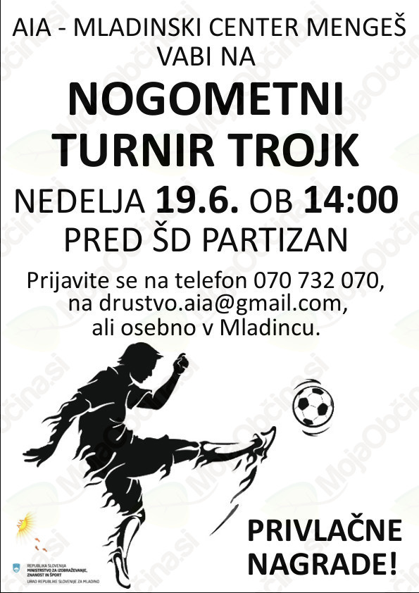Če radi igrate nogomet in se bi radi preizkusili proti drugim ekipam vas vabimo na nogometni turnir trojk, ki bo potekal 19.6. ob 14.00 pred ŠD Partizan v Mengšu.
