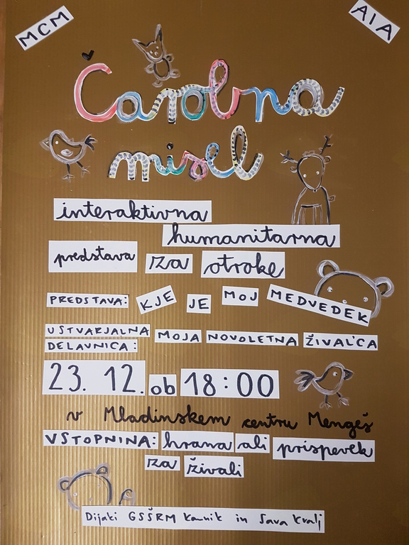 Preden se mladinc odpravi na praznične počitnice vas vabimo, da se nam pridružite na otroški predstavi, ki so jo pripravili dijaki GSŠRM Kamnik. Predstavi je naslov: ''Kje je moj medvedek'' in se bo odvijala 23.12. ob 18:00. Po predstavi se lahko otroci pozabavajo pri izdelavi novoletne živalice, ki jo bo vodila Sava Kralj.