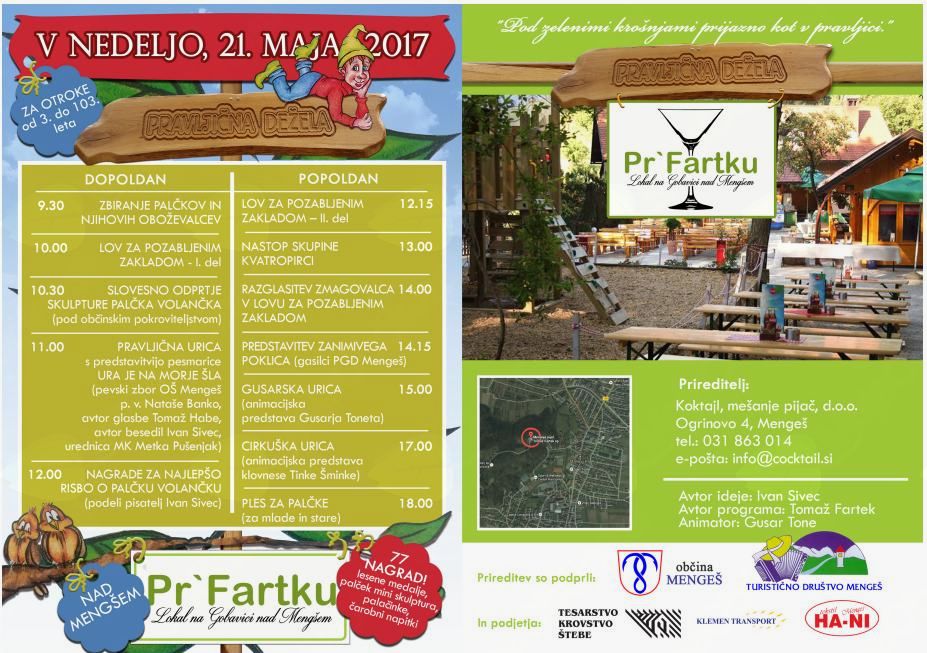 Lepo vabljeni v nedeljo 21. maja od 9. ure dalje na prireditev "Pravljična dežela Pr` Fartku" na hribčku Gobavica nad Mengšem. Nov palček, nova zgodba in pravljično celodnevno dogajanje za najmlajše, družine in vse obiskovalce od 9. do 19. ure. Letos je na vrsti Palček Volanček, zgodba pisatelja Ivana Sivca, ki pripoveduje, kako si palčki priredijo tekmovanje v formuli 1. "Svoje dirkalnike si izdolbejo iz želoda, stezo jim poslinijo polži, poganja pa jih jesenski vetrič. Palček Volanček, Palček Menjalček in Palček Smejalček štartajo vsi hkrati, v prvem krogu si veliko prednost pridobi poogumni Palček Smejalček. Vse je že kazalo na to, da bo zmagal, a se je v zadnjem krogu zaletel v štor. Vrata k zmagi so bila tako odprta za Palčka Volančka, ko pa je videl, kaj se je zgodilo, se je ustavil in pomagal Palčku Smejalčku. Zmagal ni noben od njinu, temveč - dobro srce !" (cit. Ivan Sivec)