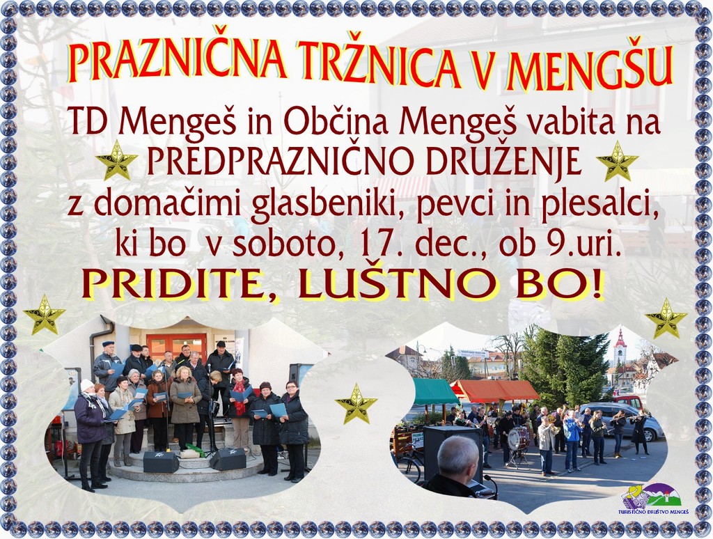 Turistično društvo Mengeš in Občina Mengeš vabita na predpraznično druženje na mengeški tržnici ob gasilsko godbenem domu v Mengšu. Za dobro razpoloženje bodo poskrbeli domači glasbeniki, pevci in plesalci. Pridite, luštno bo!
