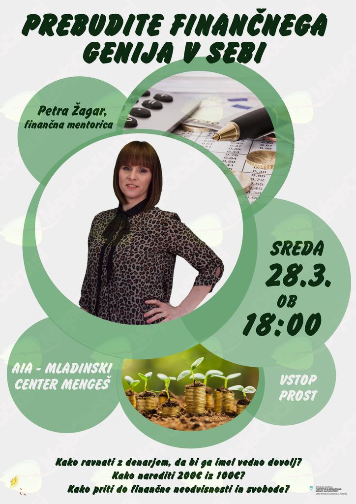 Bogati in uspešni ljudje se od revnih in povprečnih ločijo po načinu razmišljanja in delovanja. Če želiš spoznati kako razmišljajo eni in drugi, vabljen na predavanje z naslovom PREBUDI FINANČNEGA GENIJA V SEBI, kjer boš spoznal kako pomembne so naše misli, prepričanja in denarni zapis, ki te vodijo do zadovoljstva in uspeha in kako ravnati z denarjem, da bi ga imel vedno dovolj in da bi si iz 100 eurov naredil 200 eur. Iz 1000 eur pa 2000 eur. Pa vse tja do finančne neosvisnosti in svobode. Na predavanju bodo podane osnove finančne pismenosti, ki se jih nismo nikoli učili niti v šoli, niti doma.