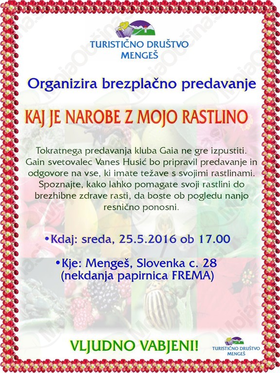 Tokratnega predavanja Kluba Gaia resnično ne gre izpustiti: Gain svetovalec Vanes Husić bo pripravil predavanje in odgovore na vse, ki imate težave s svojimi rastlinami. Spoznajte, kako lahko pomagate svoji rastlini do brezhibne in zdrave rasti, da boste ob pogledu nanjo resnično lahko ponosni. Brezplačno predavanje bo na Slovenski c. 28, v prostoru nekdanje papirnice Frema.
