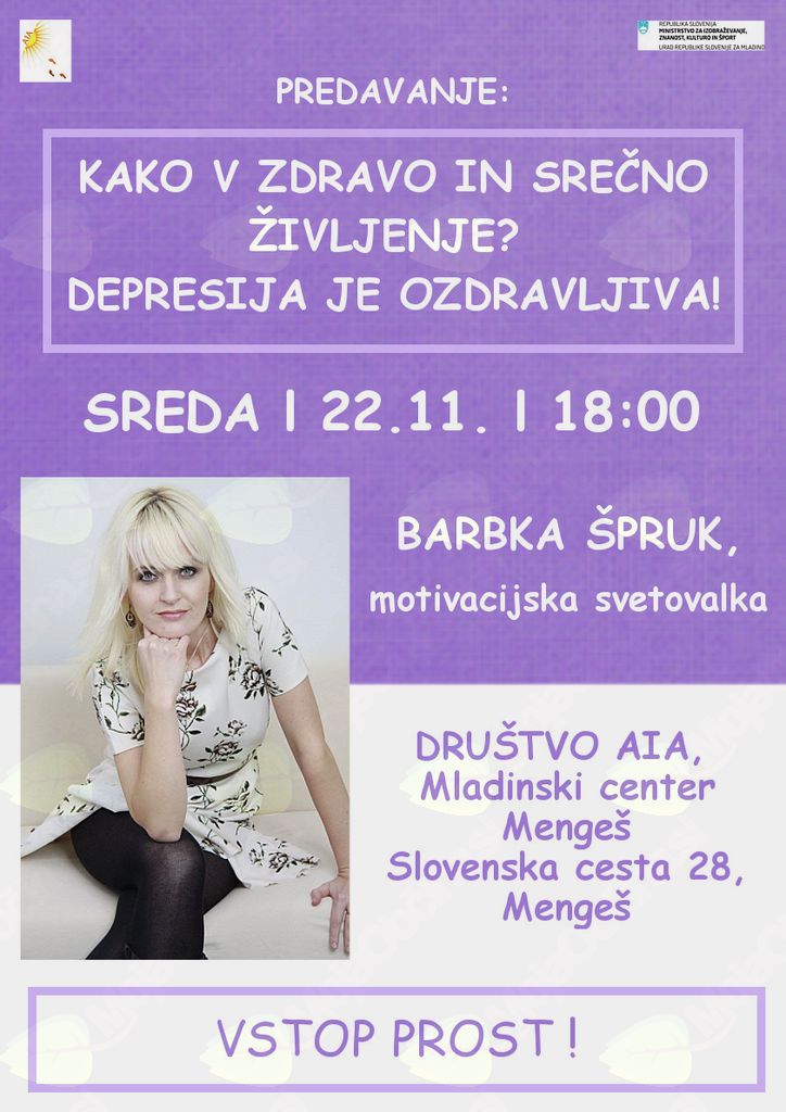 Vabimo vas, da se nam pridružite na predavanju, kjer vam bo govornica Barbka Špruk, predstavila svoje izkušnje, kako zmagati proti depresiji in zaživeti.