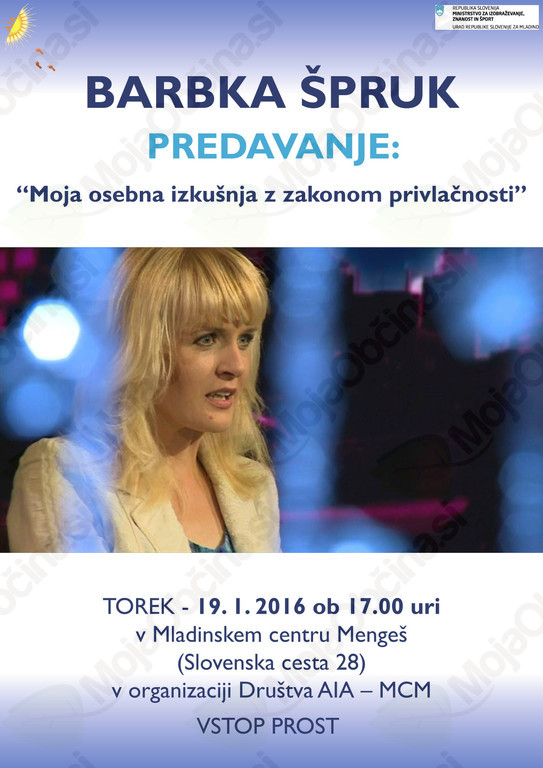 V torek, 19.1., ob 17.00 bomo v Mladincu v Mengšu gostili Barbko Špruk, gostjo mnogih TV oddaj in časopisnih medijev, ki bo tokrat spregovorila o tem, kako je zakon privlačnosti uporabila v svojem življenju.