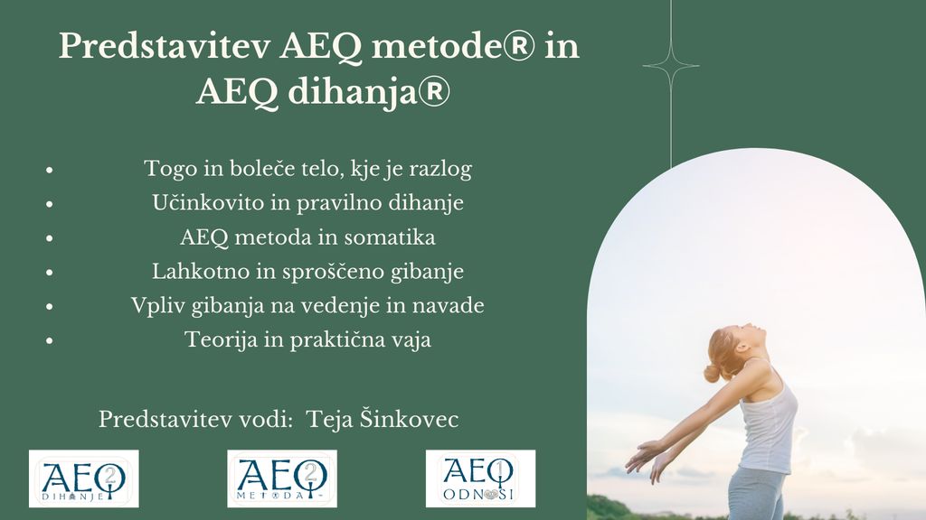 Predstavitev vodi Teja Šinkovec, učiteljica AEǪ metode in dihanja 2. stopnje in AEǪ odnosov 1. stopnje.