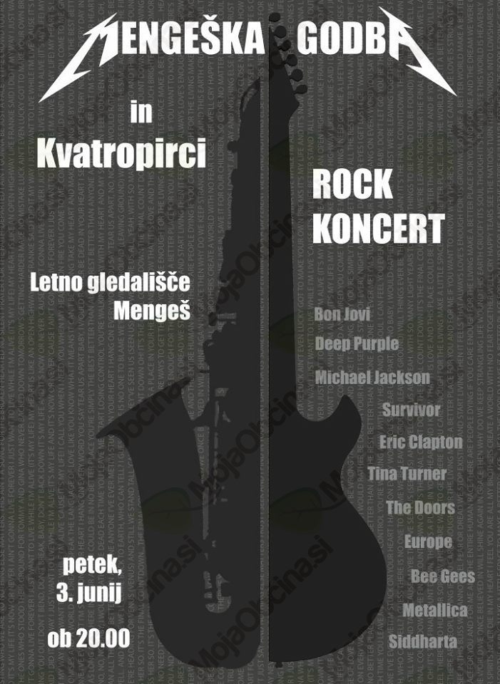 V Sloveniji je gostovalo že mnogo odličnih svetovnih glasbenih zvezd, mengeški godbeniki pa jih bomo samo za Vas gostili v Mengšu, natančneje v Pruhu (letno gledališče Mengeš, pri tabornikih, kamnolom...). Z nami bodo zapeli Kvatropirci, ki bodo nadaljevali glasbeni večer tudi po našem nastopu. Za pijačo in večerjo z glasbeno spremljavo bo poskrbljeno. Vstop prost! Vljudno vabljeni! Povabilo pa lahko delite tudi s svojimi prijatelji.