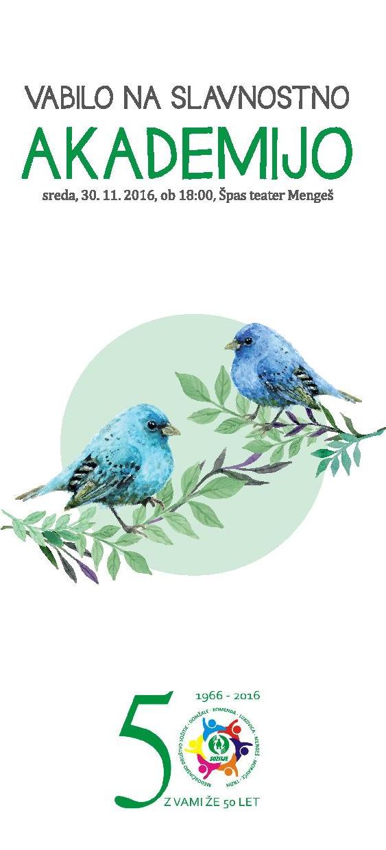 Naše društvo Sožitje letošnje leto praznuje Abrahama. To priložnost bomo v sredo, 30. 11. 2016, obeležili s slavnostno akademijo v Kulturnem domu v Mengšu. Nastopili bodo naši člani, to je plesna skupina Sončki in Face ter glasbena skupina Strune, z nami pa bodo tudi učenci OŠ Roje, ansambel Dori, plesalke Cowboy ritma, učiteljski pevski zbor OŠ Šenčur in Omar Naber. Program bo povezoval Boštjan Meglič - Peška. Po končani prireditvi bo sledila pogostitev. Vstop je prost, vsi prisotni bodo v spomin na dogodek dobili unikatni umetniški izdelek naše članice Tanje Lukman.