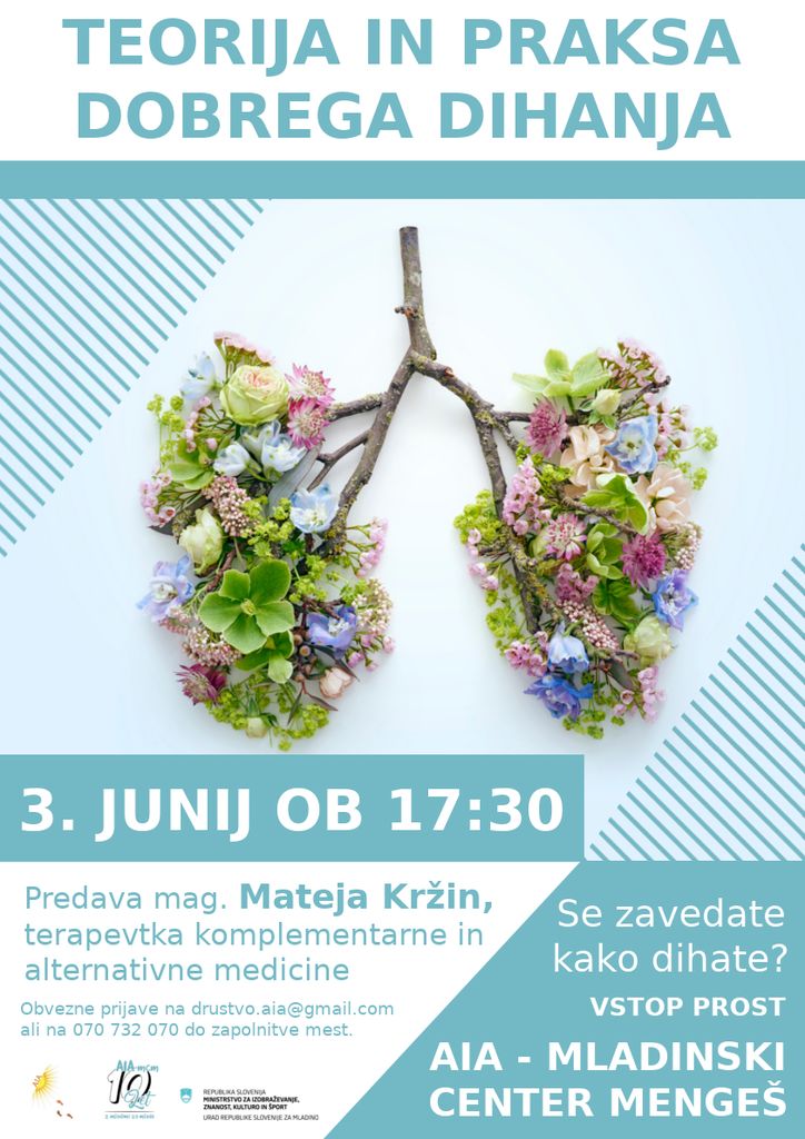 Na predavanju se bomo dotaknili osnovne anatomije dihanja, spoznali bomo pravilno tehniko dihanja in se naučili nekaj dihalnih praks z različnimi učinki na telo in duha.