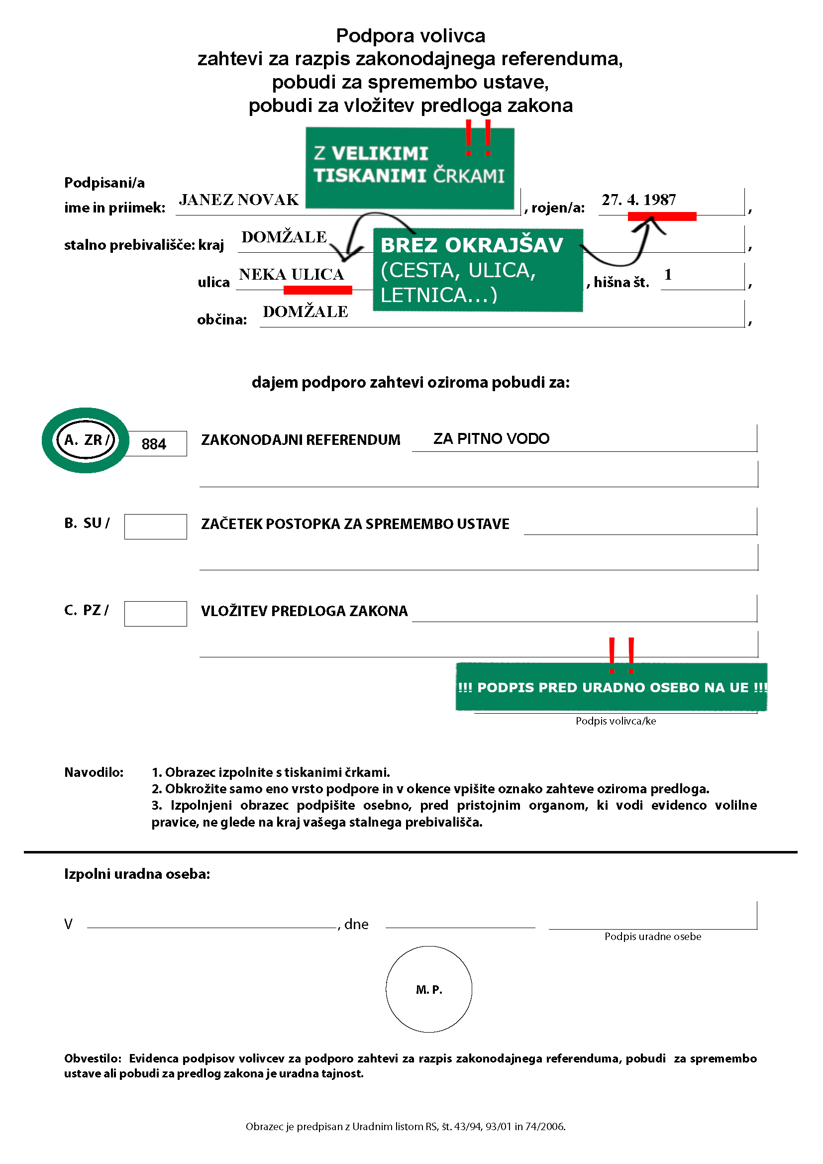 Obrazec dobite na upravni enoti (bodite pozorni, da na obrazcu piše ZA PITNO VODO). Izpolnite ga lahko že vnaprej, a ga v nobenem primeru na upravno enoto ne smete prinesti že podpisanega - veljavni so le obrazci, podpisani pred uradno osebo na upravni enoti. Vse podatke zapisujte z velikimi tiskanimi črkami, ne uporabljajte kratic, pišite čitljivo.