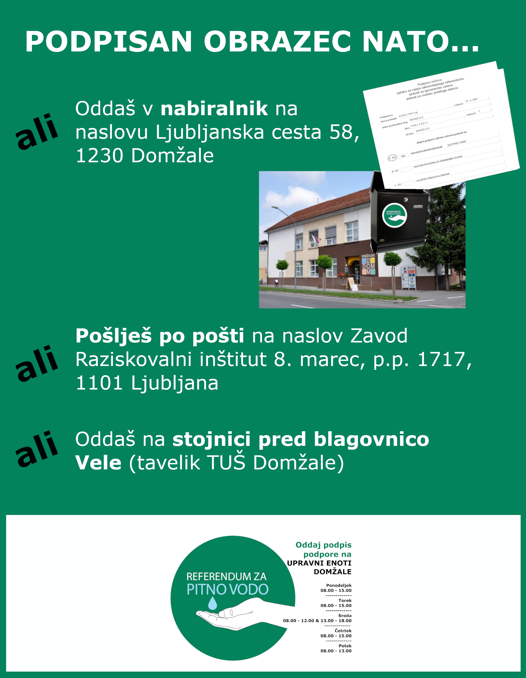 - oddate na stojnici pred blagovnico Vele (TUŠ supermarket Domžale), kjer ga bodo prostovoljci skrbno shranili in ga nato dostavili pobudnikom referenduma,
