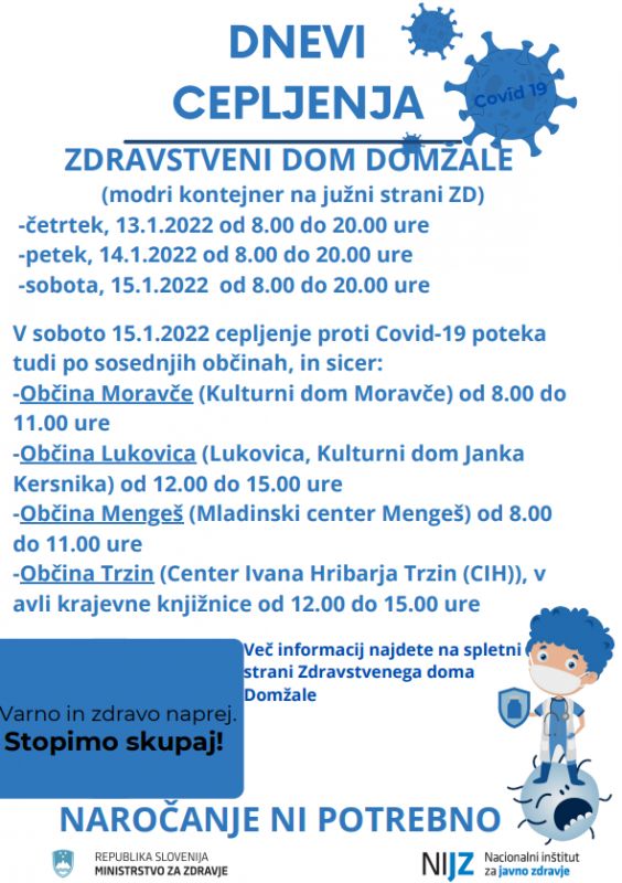 V okviru nacionalne akcije Dnevi cepljenja, Zdravstveni dom Domžale obvešča, da od četrtka, 13. januarja, do sobote, 15. januarja 2021, izvaja cepljenje proti Covid-19 za nenaročene paciente. V soboto bo cepljenje za nenaročene paciente tudi v občinah ustanoviteljicah. V občini Mengeš bo cepljenje potekalo v Mladinskem centru Mengeš, od 8.00 do 11.00.