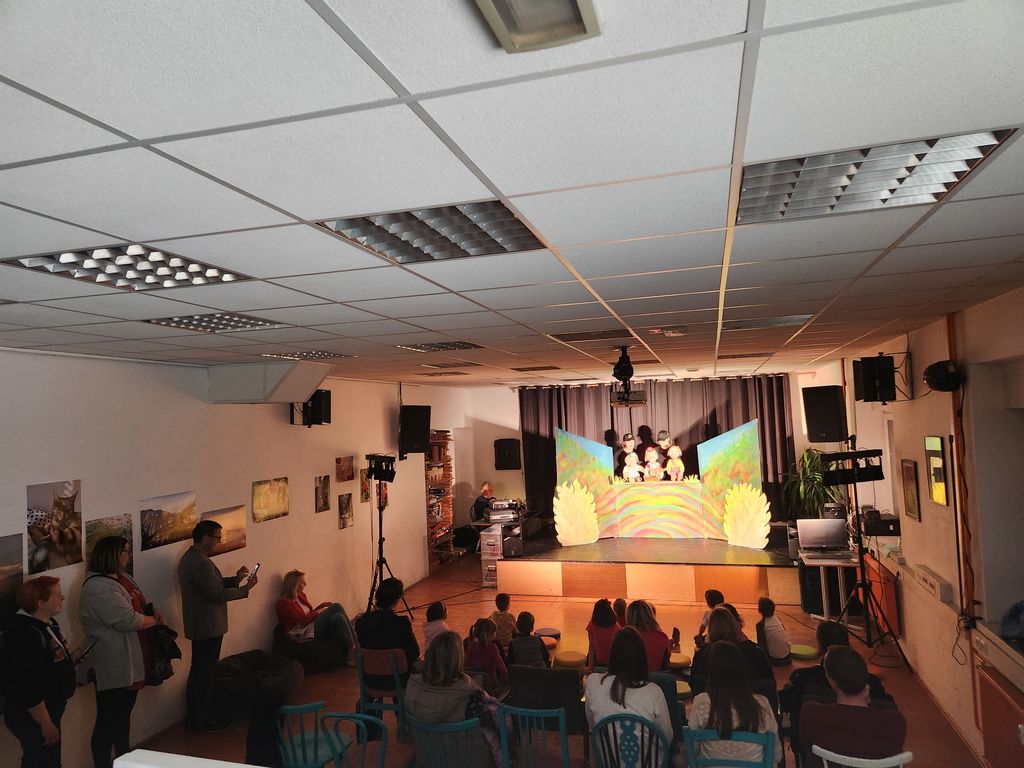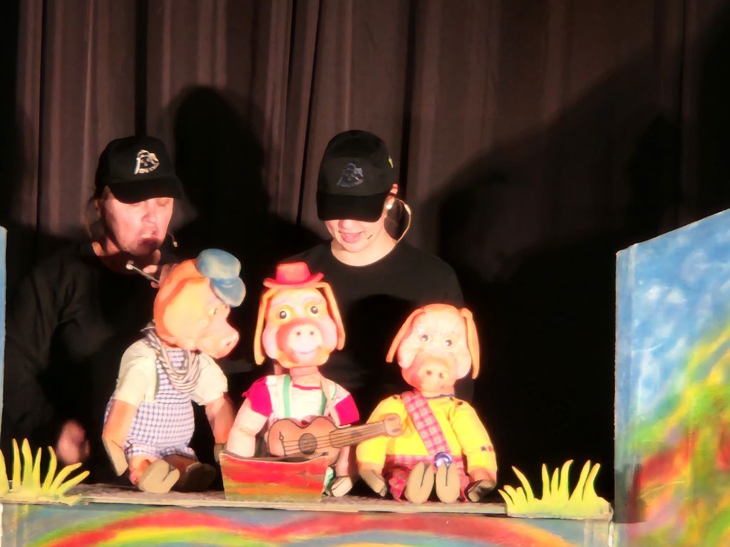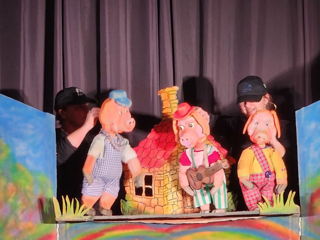 In še nekaj besed o predstavi. Trije prašički zapustijo varno domače ognjišče in gredo v svet iskat srečo ter si ustvarit svoj lastni dom. Pred hudobnim in požrešnim volkom se skrijejo v svoje hišice, narejene iz slame, vejevja in kamenja.