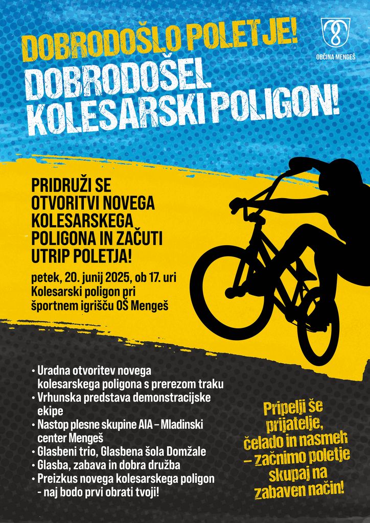Vabljeni na otvoritev nove atrakcije za vse kolesarske navdušence v Mengšu! V petek, 20. junija 2025, ob 17. uri se dobimo pri novem kolesarskem poligonu ob športnem igrišču OŠ Mengeš, kjer bomo skupaj uradno odprli novo športno pridobitev, namenjeno zabavi, gibanju in učenju novih spretnosti na dveh kolesih.