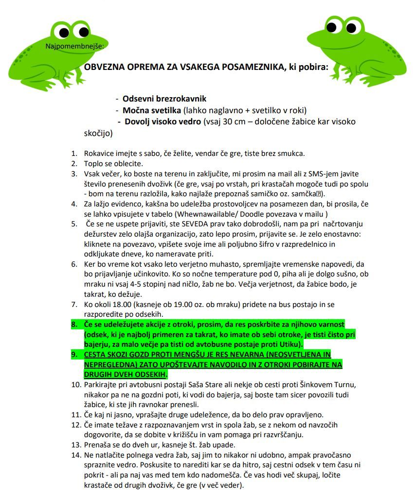 Vabimo vas, da nam pomagate pri prenašanju žabic, da jih tudi v letošnjem letu v čim večjem številu prenesemo čez cesto proti bajerju.Selitev se začne ob mraku, če je jasno je to okrog 18h-18.10, če pa je oblačno, pa je to nekje 17.45 uri.