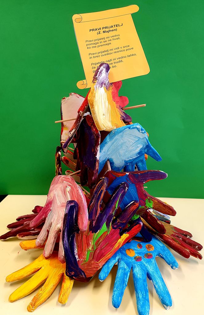 V tem mesecu smo se vključili tudi v natečaj »Spodbujamo prijateljstvo«. Tema je v današnjem času za otroke še kako pomembna. Namreč otroci potrebujejo druženje s sovrstniki, potrebujejo prijatelje, spontano igro, igranje vlog ... Tako smo nekaj časa namenili tudi pogovoru o prijateljstvu, kdo je prijatelj, kako se obnašajo prijatelji drug do drugega in kako pomembno je imeti prijatelja, na katerega se lahko zaneseš. V okviru projekta smo iz fimo mase izdelali roke vsakega otroka, ki so jih otroci pobarvali z izbranimi barvami; vse skupaj pa sestavili v skulpturo, ki ponazarja tkanje prijateljskih vezi oz. skupaj zmoremo vse.
