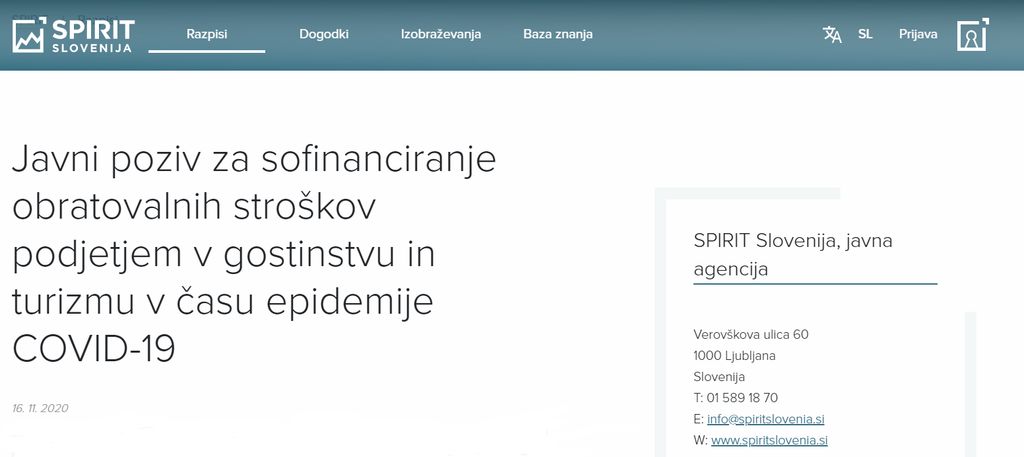 Javni poziv za sofinanciranje obratovalnih stroškov podjetjem v gostinstvu in turizmu v času epidemije COVID-19