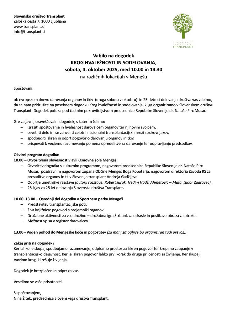 Ob Evropskem dnevu darovanja organov in tkiv bo v Mengšu potekal poseben dogodek Krog hvaležnosti in sodelovanja, ki ga pripravlja Slovensko društvo Transplant. Dogodek bo potekal pod častnim pokroviteljstvom predsednice Republike Slovenije dr. Nataše Pirc Musar, ki bo s slavnostnim nagovorom odprla prireditev.