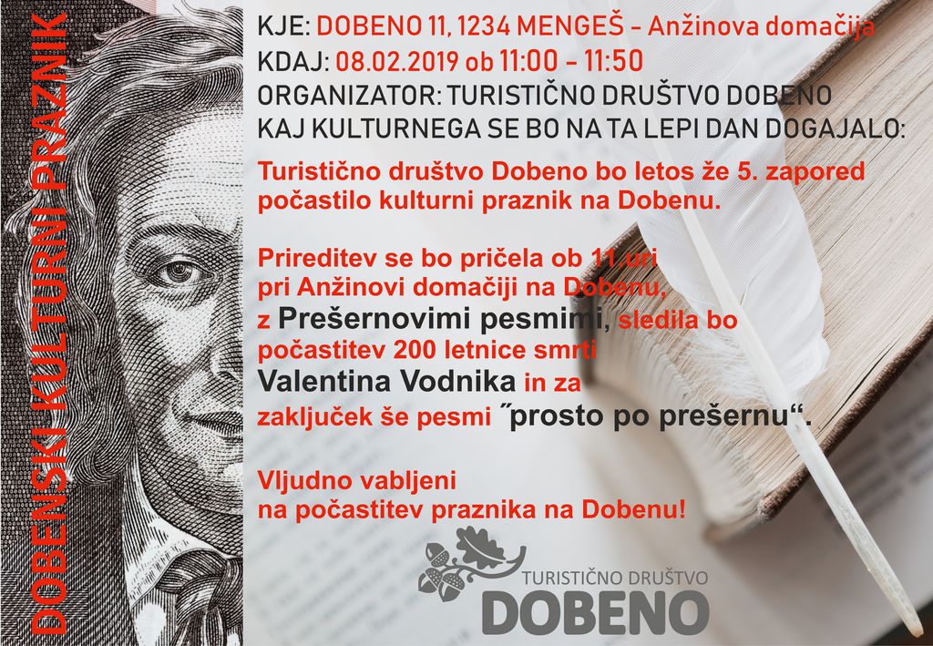 Praznovanje, ki se je začelo ob 11. uri, je tudi letos potekalo na dvorišču Anžinove domačije, saj prostor na velikem dvorišču stare domačije nudi zelo prijetno in primerno kuliso za izvedbo prireditve. Poleg tega je k prijetnemu ambientu pripomogla tudi stojnica TD pri vhodu na prireditveni prostor, bogato založena z raznovrstnim domačim pecivom, pa tudi kuhano vino, topel čaj in »ta kratki« so bili na njej, kar so vse prispevali pridne domačinke, KT Blaž in Dobenski hram. Letos so naše zavzete kulturnice v režiji animatorke Mete Selan, pripravile program v treh segmentih: recitacije Prešernovih pesmi s poudarkom na »igrani« recitaciji Lepa Vida, ki so jo recitatorke izvedle v primernih kostumih in narodnih nošah, bila pa je poudarjena tudi scensko. Sledila je počastitev spomina na Valentina Vodnika, ob 200. obletnici njegove smrti, zadnji del pa je bil namenjen pesmim "prosto po Prešernu", pri čemer sta Frančiška Hunjet in Marta Premk predstavili svoje lastne pesmi.