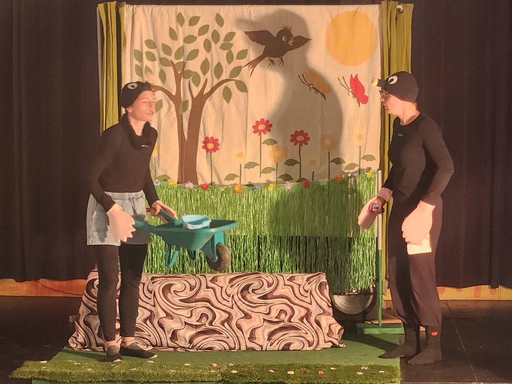 Predstava, primerna za otroke, stare tri leta in več, je v kratki zgodbi pokazala, kako se dva krtka najprej skregata, ker vsak vztraja pri svojem, a kmalu ugotovita, da so nesporazumi odveč in da je skupno igranje veliko lepše.