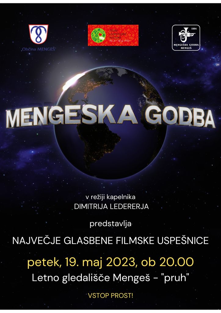 V petek, 19. maja 2023, ob 20. uri bodo ob filmskih projekcijah zazvenele številne glasbene filmske uspešnice in uvodne špice nekaterih risanih filmov. Vabljeni v kino na prostem z Mengeško godbo pod vodstvom kapelnika Dimitrija Ledererja in solisti. Za zabavo, odlično glasbo, hrano in pijačo bo poskrbljeno, manjkate le še vi in vaši prijatelji. V koledarčku si torej naredite zabeležko – Filmski koncert z Mengeško godbo – petek, 19. maj 2023, ob 20.00.