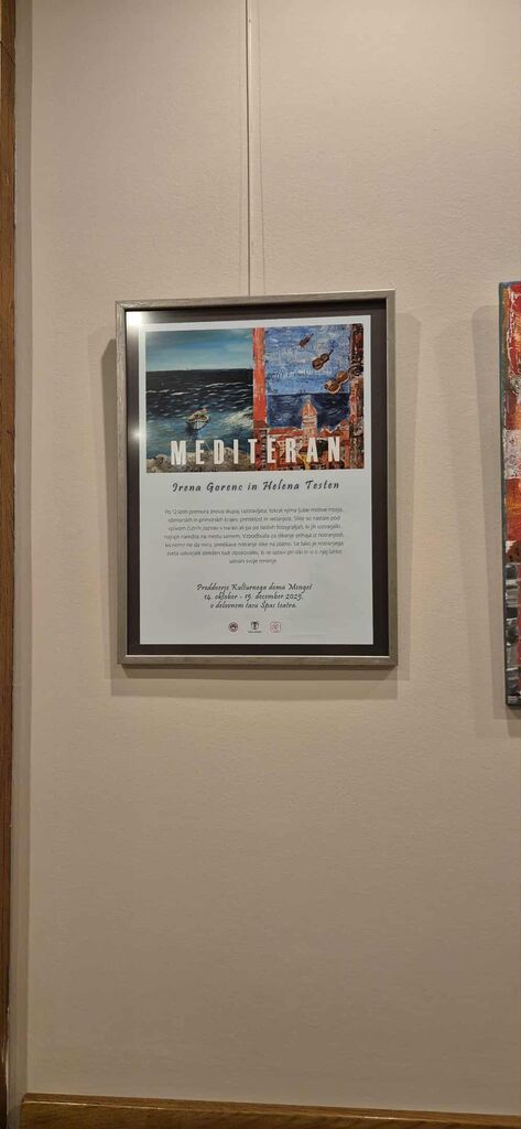 V Kulturnem domu Mengeš po več kot desetletju zopet družno razstavljata svoja likovna dela dve ljubiteljski slikarki, Helena Testen in Irena Gorenc. Tokrat je njun opus namenjen morskim motivom, zato sta ga naslovili »Mediteran«. Razstavo odlikujejo slikoviti motivi morja, obmorskih krajev ter življenja v njem in ob njem. Njune slike govorijo same zase. Vsaka slika nosi del njunega pogleda na svet, njun odziv na naravne in družbene danosti.