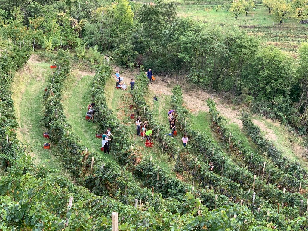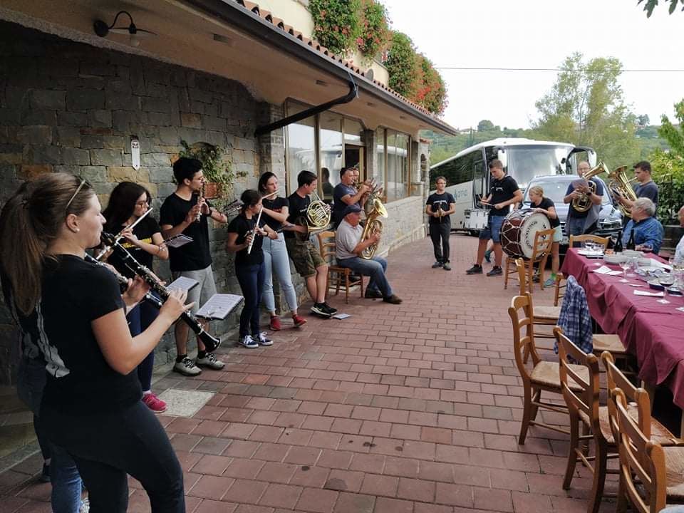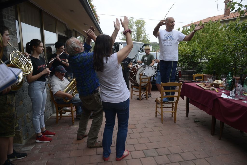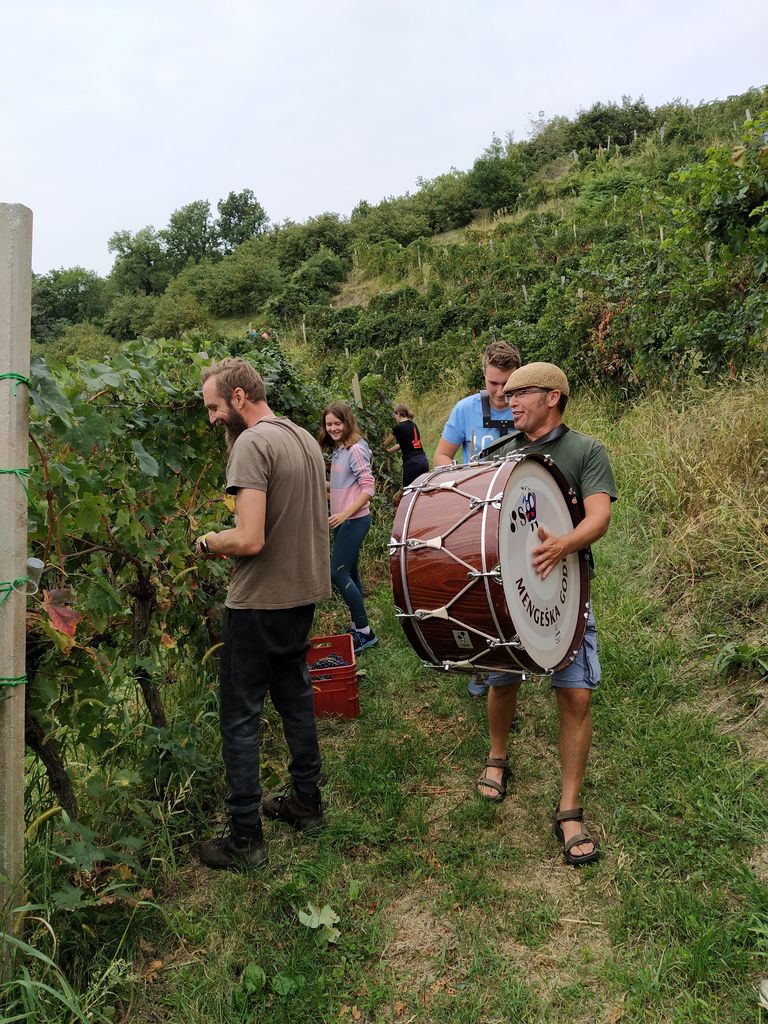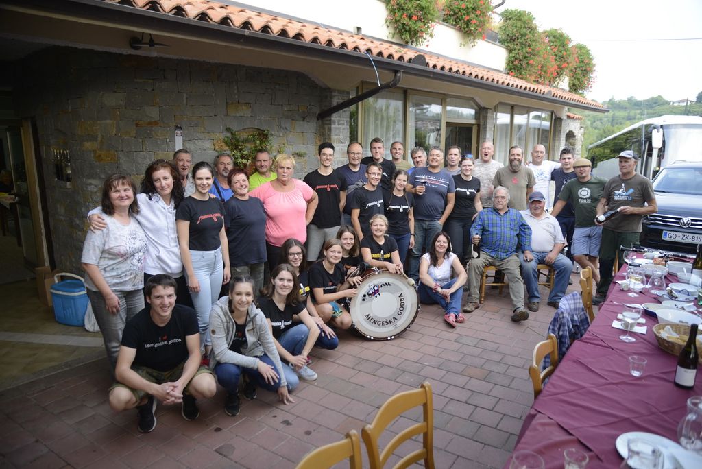V soboto, 25. septembra, pa so melodije Mengeške godbe odmevale na Primorskem. Povabljeni smo bili namreč na trgatev v Goriška brda, v vasico Hum na kmetijo pri Tomažičevih. Iz Mengša smo se odpravili v zgodnjih jutranjih urah in prispeli v "slovensko Toskano", ki je bila še odeta v meglice. Po jutranji kavici in zajtrku smo najprej v roke vzeli instrumente in zaigrali gostiteljem in drugim obiralcem v pozdrav. Nato so nas z vozili odpeljali v Brda, kjer smo instrumente zamenjali za škarje in se lotili dela. Trgatev nam je šla odlično od rok, za enakomeren delovni ritem so poskrbeli tolkalci. Delo je potekalo gladko in končali smo ga prej, kot je bilo predvideno. Po odličnem kosilu in primorski joti smo navzočim še enkrat zaigrali in zapeli. V vlogi dirigenta se je dobro znašel tudi naš župan Franc Jerič. Pred odhodom domov smo si obljubili, da se še srečamo. Kot zanimivost naj dodamo, da sta se na ta dan po dolgih letih spet srečala gospodar Igor Tomažič in naš baritonist Janez Per, ki sta pred mnogimi leti skupaj služila vojaški rok. Hvala vsem, ki ste sodelovali pri organizaciji tega prijetnega dogodka.