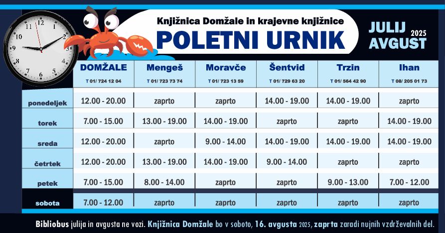 S 1. julijem pričnemo v Knjižnici Domžale in njenih enotah s poletnim urnikom, ki velja do 31. avgusta.