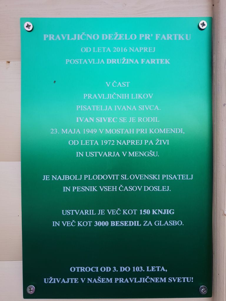 "Pravljično deželo Pr`Fartku od leta 2016 naprej postavlja družina Fartek. V čast pravljičnih likov pisatelja Ivana Sivca. Ivan Sivec se je rodil 23. maja 1949 v Mostah pri Komendi, od leta 1972 naprej pa živi in ustvarja v Mengšu. Je najbolj plodovit slovenski pisatelj in pesnik vseh časov doslej. Ustvaril je več kot 150 knjig in več kot 3000 besedil za glasbo." V veliko veselje nam je, da tako lepo skupaj sodelujemo. Za nas je gospod Ivan Sivec zelo posebna oseba. Človek, ki verjame v nas in tako skupaj ustvarjamo uspešno zgodbo.