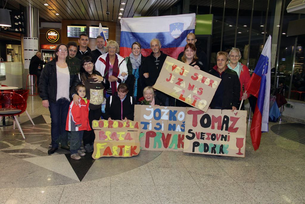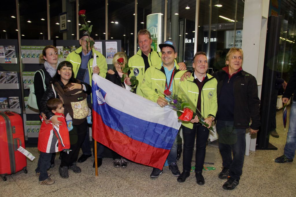 Po opravljenih nastopih, razglasitvah, druženju in veselju so se fantje po nekaj dneh vrnili v soboto zvečer, kjer smo jih na Brniku pričakali z velikim sprejemom, vključno s fotografi in novinarji, nato pa sta sledila presenečenje in sprejem v domačem gostinskem obratu Pr`Fartku nad Mengšem, kar je trajalo vse do jutranjih ur in tudi deževni večer nas ni ustavil.