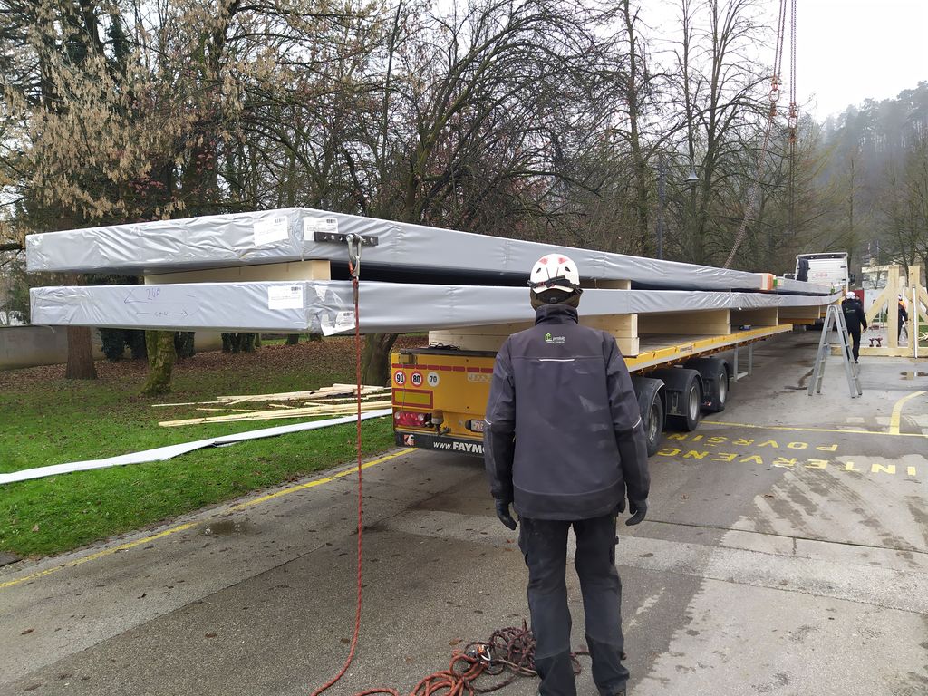 Nosilce za strešno konstrukcijo dvorane je bilo potrebno pripeljali z Avstrije, s posebnim spremstvom in dovoljenjem za prehod Karavanškega predora. Seveda pa je bilo potrebno pripraviti tudi lokacijo v Mengšu, poiskati območje v bližini dvorane, kjer jih lahko odložijo ter seveda, najhitreje dostavijo na gradbišče. Izvajalec se je skupaj z investitorjem odločil za lokacijo ob občinski stavbi, kar je pomenilo zaporo dela Športnega parka Mengeš, območja ob Kulturnem domu Mengeš, demontažo avtobusne postaje ob občinski stavbi ter prilagoditev cestnega prometa na Slovenski cesti.