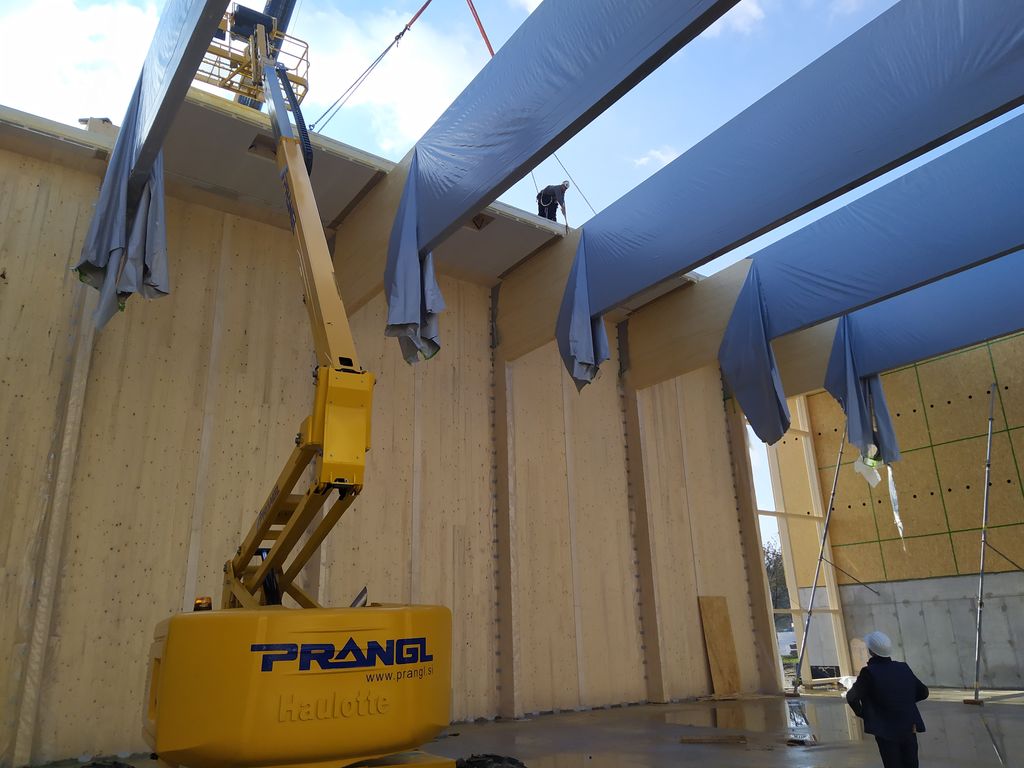 Izvedba izrednega logističnega podviga je, po zagotovitvi vseh potrebnih vlog in dokumentov, potekala tekoče in ni ogrožala drugih udeležencev v prometu. Nosilci za strešno konstrukcijo dvorane so s posebnim prevozom prepotovali več kot 100 km. V Mengeš so bili z izrednim prevozom v treh sklopih dostavljeni v nočnih urah. V zgodnjih jutranjih urah se je pričel prenos na gradbišče, dvig in vgradnja. Prvo 220-tonsko avtodvigalo je posamične nosilce prenašalo iz parkirišča pred Kulturnim domom, čez Pšato na gradbišče, kjer je nosilec drugo 200-tonsko avtodvigalo dvignilo na streho bodoče športne dvorane. Pred prenosom nosilcev je bila dodatno povečana varnost na območju Športnega parka Mengeš, okolici in parkirišču Kulturnega doma Mengeš in samem gradbišču. Vseh osem nosilcev je bilo nameščeno med 26. in 28. novembrom 2019. V prvih decembrskih dneh je izvajalec nadaljeval delo z nameščanjem prefabriciranih montažnih strešnih elementov. V decembru se bo izvedlo tudi zasteklitev steklenih fasadnih sten, tako da bo objekt še v letošnjem letu zaprt in se bo v zimskih mesecih lahko nemoteno izvajalo dela v notranjosti.