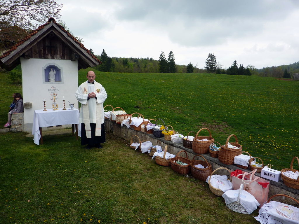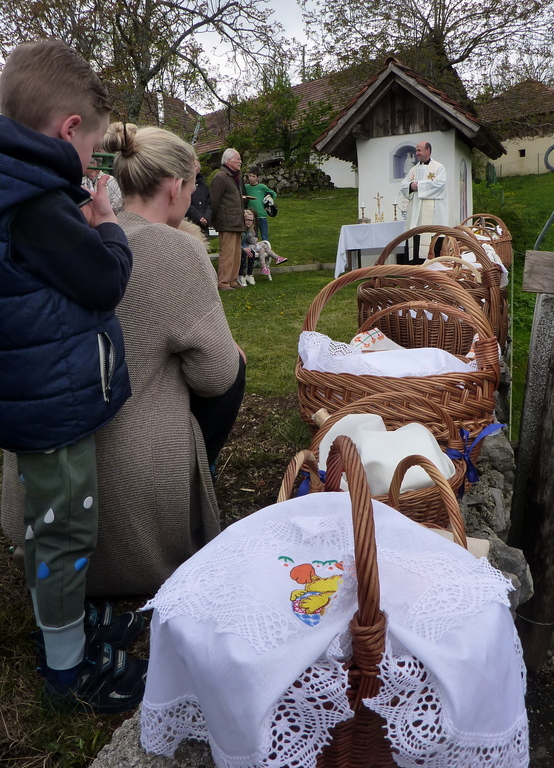 Dopoldansko slabo vreme se je popoldan popravilo in obiskovalce je pozdravilo toplo, pomladno sonce. »Žegnanja«, pri kapelici Anžinove domačije, ki ga je organiziralo TD Dobeno, skupaj z župnijo Mengeš, se je udeležilo skoraj sto ljudi, od tega je bilo tretjino otrok. Obred je opravil mengeški župnik g. Janez Avsenik, ki je na začetku lepo pozdravil vse prisotne in se jim zahvalil, ker so se v tako velikem številu udeležili obreda. Veliko število navzočih, na velikonočnem blagoslovu in lepo vreme je obogatilo praznično soboto na Dobenem.