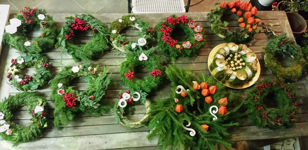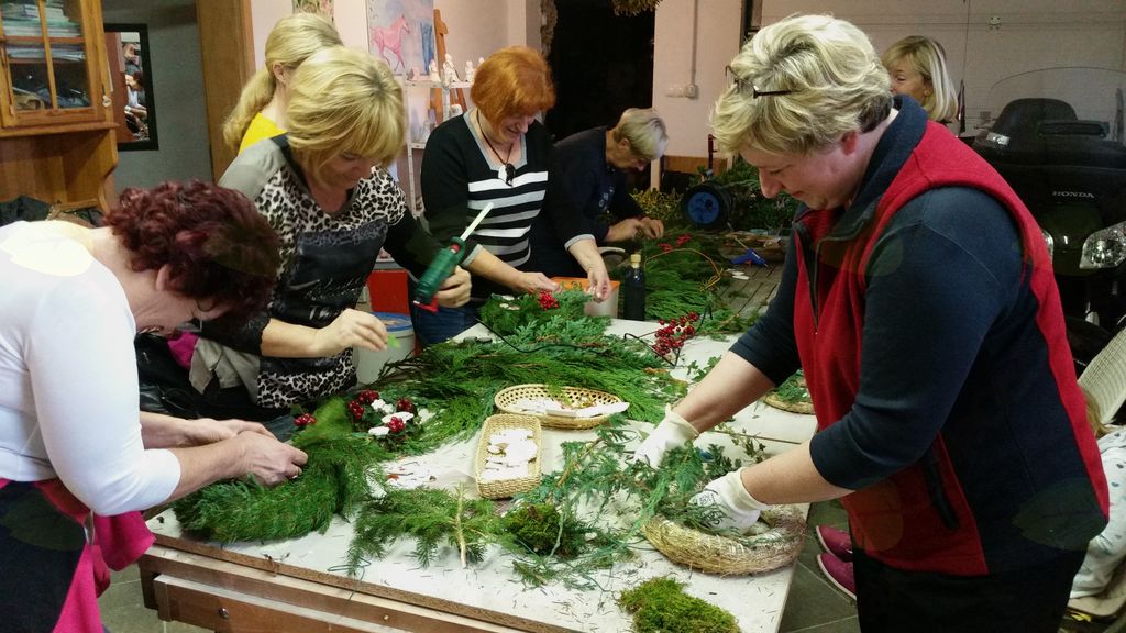Ker mnogim adventni venčki in novoletni okraski pričarajo tisto pravo, toplo in praznično prednovoletno vzdušje v svojem domu, je bilo zanimanje za delavnico precejšnje, a zaradi omejenega prostora v Brigitinem ateljeju je delavnica lahko sprejela le 15 udeležencev. Tako smo morali, na žalost, nekaj interesentov odkloniti.