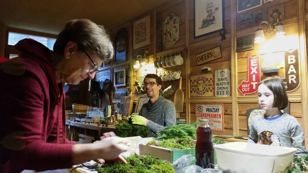 Letos smo se zbrali v soboto, 25. novembra, zgodaj dopoldne. Brigita in Matic sta nam najprej razložila osnove in postopek izdelave, nakar smo pripravili potreben material in orodje, kar sta, poleg tega, da je bila delavnica brezplačna, priskrbela naša voditelja in pričeli smo z ustvarjanjem. Pomagala in svetovala sta, kjer se je zataknilo in delo je potekalo v sproščenem in prijetnem razpoloženju, ob kavi in pecivu, ki ga je pripravila prijazna gostiteljica.