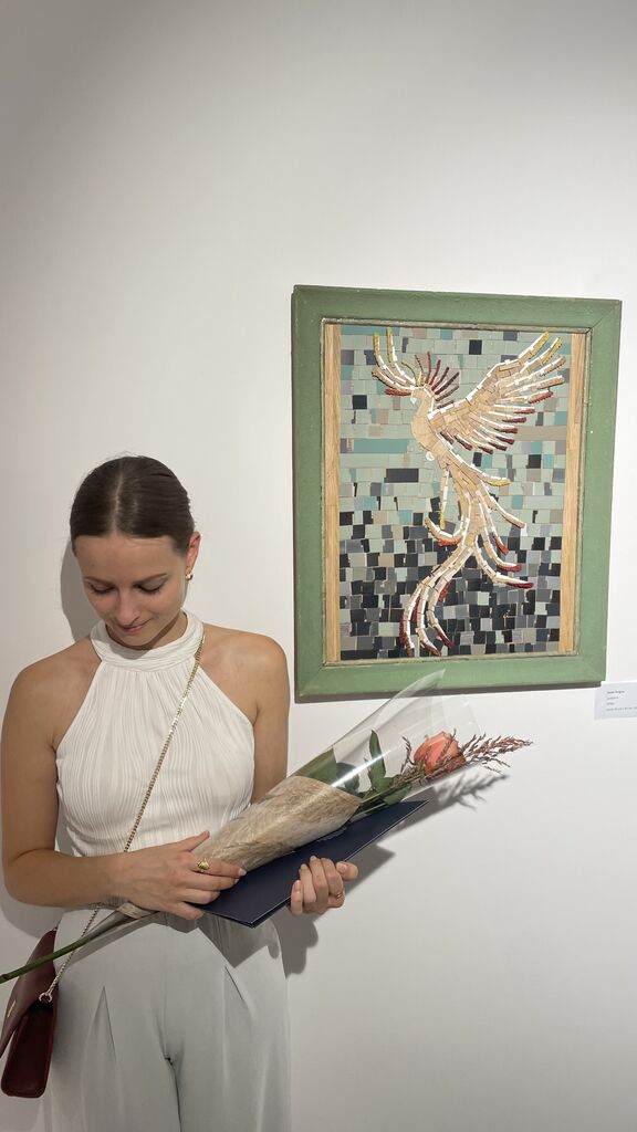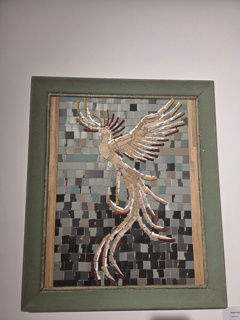Fenix je mitološka ptica, ki jo je avtorica oblikovala kot mozaično sestavljanko. Pri tem je iz različnih materialov, kot so lesene odpadne obloge, tapete in podobno, z rezanjem oblikovala koščke sestavljanke. Simbolično se fenix dvigne »iz pepela«. Iz zavrženega vstopi v novo – likovno podobo.