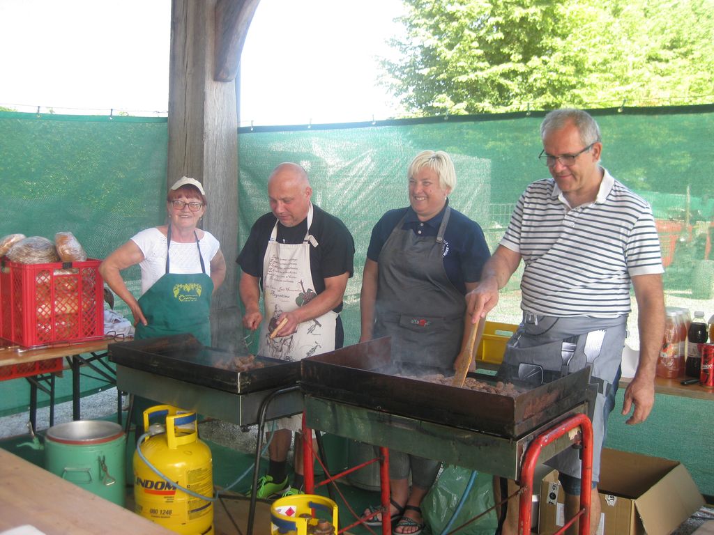 Ob veseli in poskočni glasbi Kvinteta Dori smo se vrteli in uživali ob petju. Prisluhnili smo petju članice drustva in prostovoljke na programih VŽU, Maje Keržič, ki je zapela skupaj s Kvintetom Dori. V kulturnem programu so sodelovali plesalke skupine Kavboj ritem ter plesni skupini društva Face in Sončki. Nasmejali smo se ob vragolijah poštarja Peške, ki je poskrbel, da so se župani pomerili v pripravi praženega krompirja. Iz Šenčurja so namreč prišli tudi člani KD Šenčur s predsednico Damjano Pečnik, ki so skupaj z župani in podžupanom pripravili izvrsten pražen krompir. Za lačne želodčke je poskrbela gril ekipa prostovoljk in prostovoljcev, ki je pekla dobrote na žaru, prav tako so prostovoljci posrbeli, da nihče ni ostal žejen. Mojca in Vesna sta nam pridno kuhali kavo in promovirali Atlantic group z Barcaffe kavo, kokto in vodo Droge in Kolinske. G. Ruždi iz sladolednega butika Ćatipi iz Mengša nam je postregel odličen sladoled. Razgibalne vaje in poligon je pripravil športnik, Klemen Dolenc, in z veseljem smo se preizkusili v polionu. Prostovoljke so prodajale srečke, vsaka je bila dobitna, mame, rejnice, skrbnice in prostovoljke pa so napekle sladke dobrote.