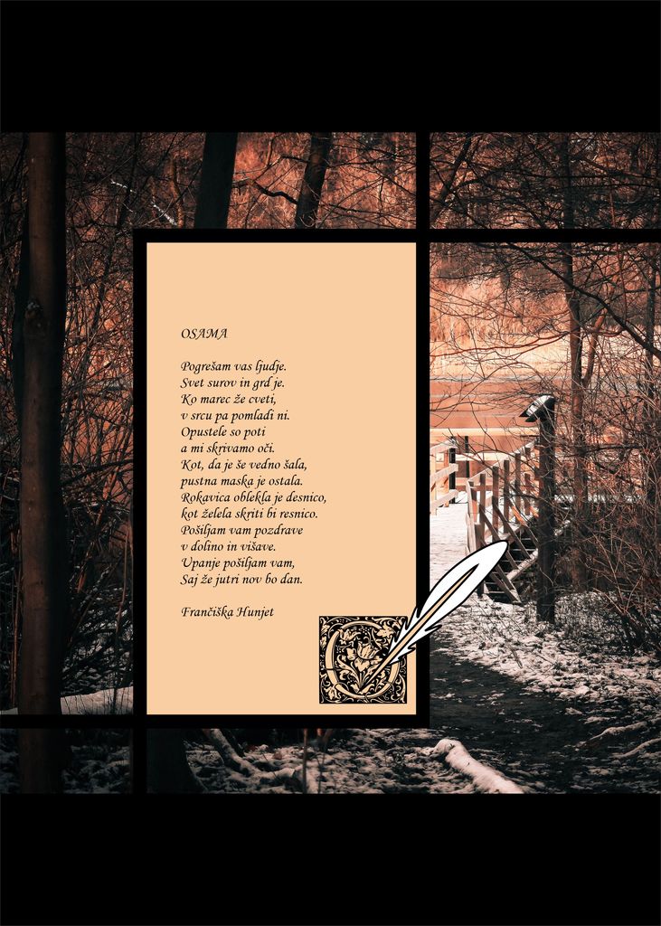 Zaradi spremenjenih razmer v knjižnici še ne prirejamo prireditev, zato žal pesniškega večera ne moremo izvesti. Odločili smo se, da izbrane verze natisnemo in razstavimo v dvorani Knjižnica Domžale. Razstavo poetičnih besed si boste lahko ogledali od 10. junija do 10. julija 2020.