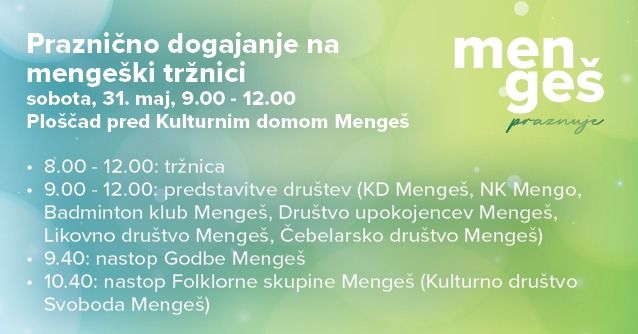 Vabljeni danes, 31. maja, med 9. in 12. uro, na ploščad pred Kulturnim domom Mengeš, kjer bo v sklopu letošnjega praznovanja občinskega praznika zaživela še zadnja praznična sobota na Mengeški tržnici. To bo praznično dopoldne, posvečeno mengeški skupnosti, lokalnim dobrotam in zgodbam, ki jih pišemo skupaj.
