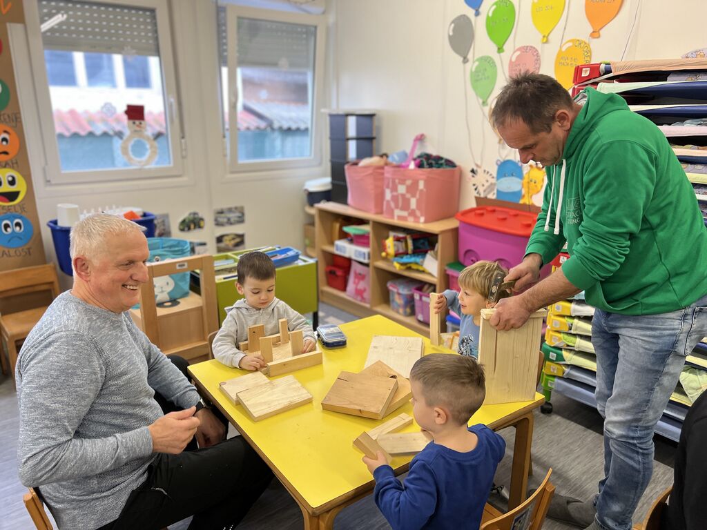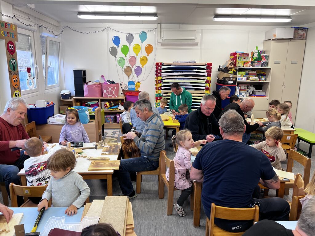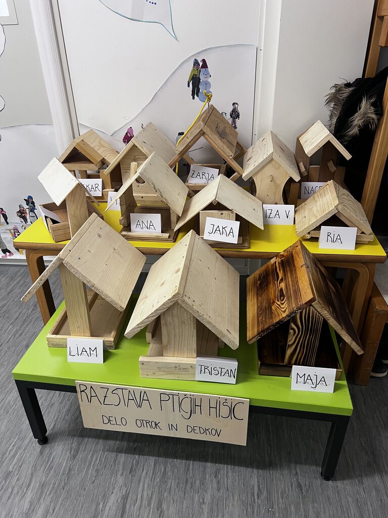22. januarja 2026 smo v skupini Mehurčki doživeli prijetno dopoldne, ki je bilo posvečeno skupnemu ustvarjanju in druženju z dedki. Obiskali so nas dedki otrok, s katerimi smo pripravili delavnico izdelovanja ptičjih hišic. Dedki so se na obisk skrbno pripravili in s seboj prinesli ves potrebni material in orodje – od lesa, žebljev, kladiv in žag. Kmalu je našo enoto napolnil zvok kladiv in žag, ki je ustvaril pravo delovno vzdušje, vladala pa sta dobra volja in smeh. Otroci so pomagali zabijati žeblje, držali deske, dedki pa so jih potrpežljivo usmerjali in spodbujali. Med delom nas je spremljala prijetna glasba, po prostoru pa je zadišalo po kavi. Po končani delavnici smo pripravili razstavo na hodniku naše enote, kjer si jo lahko ogledajo starši otrok in drugi obiskovalci.