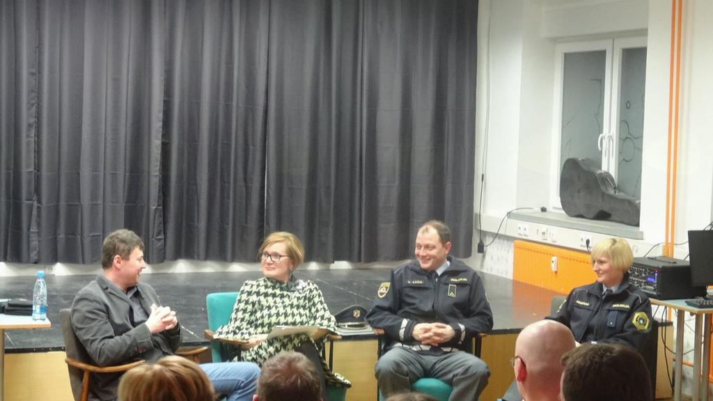 Tokrat smo spoznali poklic in delo policista, kriminalista in detektiva. Alenka je na srečanje povabila komandirja Policijske postaje Domžale, Dejana Koširja, policistko Agato Lucijo Jevnikar in direktorja Detektivske pravne agencije, Damjana Matičiča. Pogovornega srečanja se je udeležilo lepo število mladih udeležencev, postavili so tudi kar nekaj zanimivih vprašanj. Gostje so nam predstavili različne poti, ki so jih pripeljale do želenega poklica, za katerega velja, da so praktične izkušnje izredno pomembne in brez njih ni mogoče napredovati na višje položaje. Slikovito so nam predstavili vsakdanji delavnik policista, delo kriminalistov v posebnih enotah in delo detektiva, ki mora imeti tudi podjetniška znanja. Predvsem smo lahko začutili, kako pomembna je pri delu policistov solidarnost, povezanost in medsebojna pomoč med sodelavci, kar je tudi ena največjih prednosti tega poklica. Bili smo tudi presenečeni nad njihovim odgovorom, da nihče od njih v svoji dolgoletni praksi še ni zares uporabil orožja. Obrazložili so, da je Slovenija dejansko še vedno ena najbolj varnih držav na svetu.