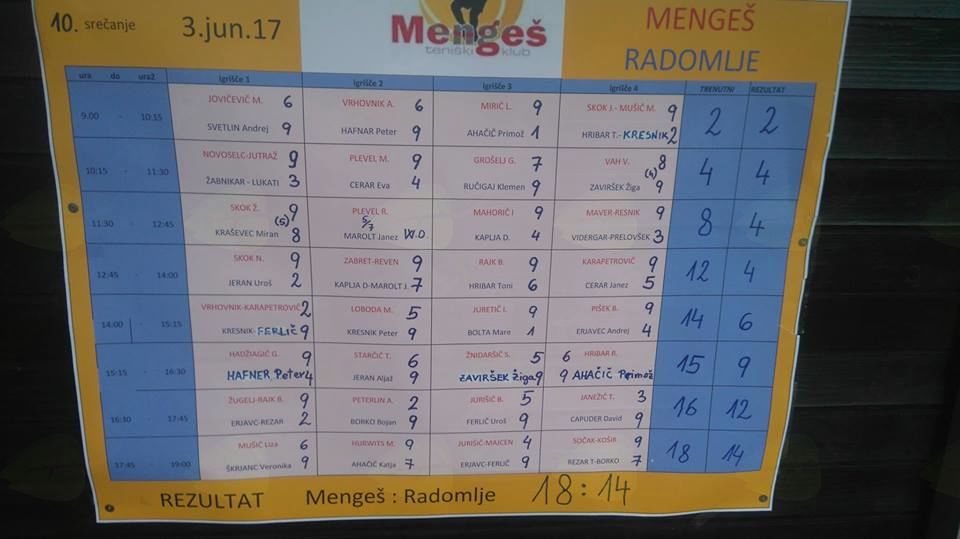 Prvi tekmi sta se odvili v jutranjih urah, in sicer že ob pol osmih v Mengšu, za tem pa se je dogajanje selilo ob Kamniško Bistrico. Radomljani so imeli tokrat močno stisko z igralci, zato so mnogi morali igrati celo večkrat. V prvem kolu je nastopila tudi izkušena in zelo nevarna dvojica Mušič/Skok(brata Brian), ki sta brez težav odpravila za pol stoletja mlajša nasprotnika. Začetek je bil zelo tesen, saj je bil izid po prvih dveh kolih 5:5. Za tem pa je sledila enosmerna cesta Mengšanov, ki so v naslednjih dveh kolih nanizali osem zaporednih zmag in izid popravili na 13:5. Ivan Juretič in Borut Pišek sta izid še nekoliko izboljšala in že v zgodnjih popoldanskih urah zmago približala na doseg roke. Mogoče je prav ta bližina zmage, manjkali sta namreč le še dve točki, uspavala Mengšane. Začel se je mrk, ki je trajal vse do nastopa Bojana Rajka in Staneta Žuglja, ki sta v kombinaciji hitrih nog in veliko mero »deblaških« izkušenj zabila zadnji žebelj v krsto. Točko sta dodala še dvojica Košir/Sočak in slavje se je lahko začelo. Končni izid, 18:14 v korist gostov. Mengšani smo bili nove zmage neizmerno veseli, saj sedaj vodimo že 7:3 v skupnem seštevku in se že nadejamo novega zvišanja izida na zimskem srečanju, ko se bodo Radomlje zagotovo v želji po maščevanju predstavile v najmočnejši možni luči.
